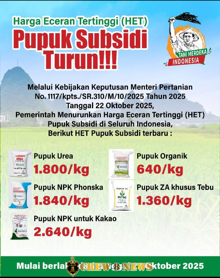 Arosuka, 29 Oktober 2025, Crew8 News,- Pemerintah Kabupaten Solok melalui Dinas Pertanian resmi menetapkan perubahan atas Keputusan Kepala Dinas Pertanian Nomor 500.6.7/794/DISPERTA-2024 tentang Alokasi dan Harga Eceran Tertinggi (HET) Pupuk Bersubsidi Sektor Pertanian Tahun Anggaran 2025.