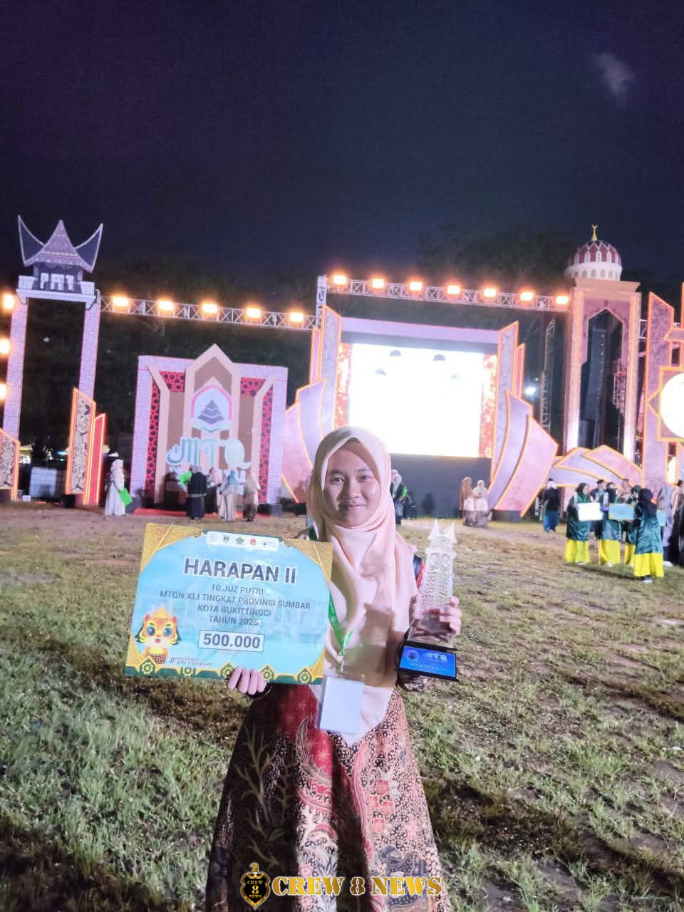 Santri pertama, Khairanti Mardhatillah, yang saat ini duduk di kelas II MAN Koto Baru, meraih Harapan II Cabang Tahfidz 10 Juz Putri. Sementara itu, Zelika Rhamadhani, mahasiswi UIN Tanah Datar, memperoleh Harapan II Cabang Tahfidz 5 Juz Non Tilawah Putri.