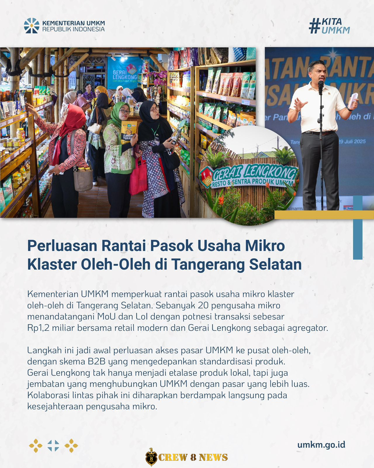 Crew8 News, Jakarta, – Kementerian Usaha Mikro, Kecil, dan Menengah (UMKM) Republik Indonesia terus mengakselerasi program penguatan ekosistem usaha rakyat melalui perluasan pasar, kemitraan strategis, serta fasilitasi ekspor pada periode 28 Juli–3 Agustus 2025.