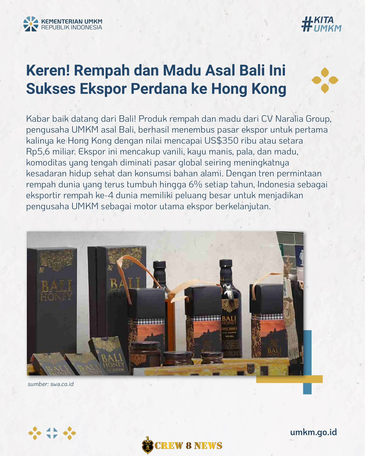 Dari Bali, CV Naralia Group sukses melakukan ekspor perdana rempah dan madu ke Hong Kong senilai US$350 ribu atau setara Rp5,6 miliar. Sementara dari Mojokerto, CV Mitraindo Shoes Pratama dengan merek No Bare Foot (NOBF) berhasil menembus pasar internasional dengan nilai ekspor lebih dari Rp 600 juta, melibatkan lebih dari 100 perajin lokal.