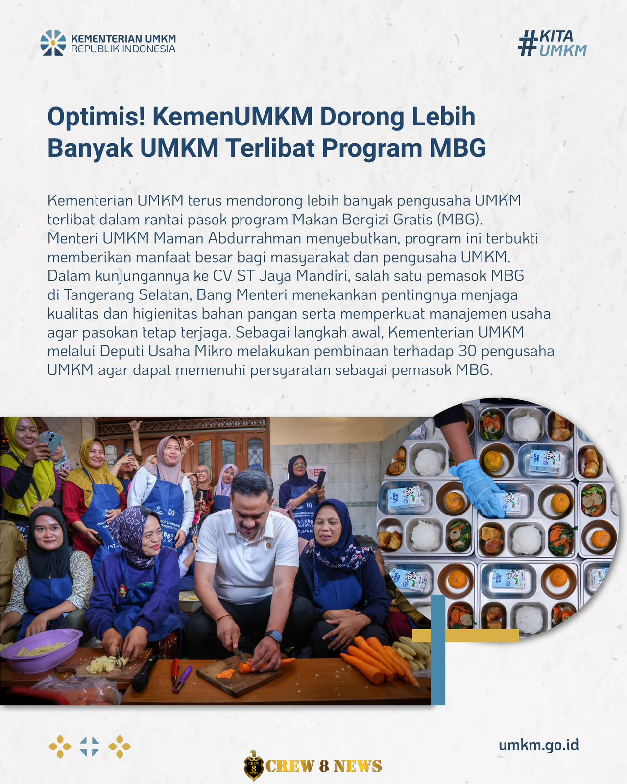Menteri UMKM Maman Abdurrahman menyatakan, pemerintah mendorong lebih banyak pelaku UMKM terlibat dalam rantai pasok Program Makan Bergizi Gratis (MBG) dengan fokus pada kualitas, higienitas, dan penguatan manajemen usaha.