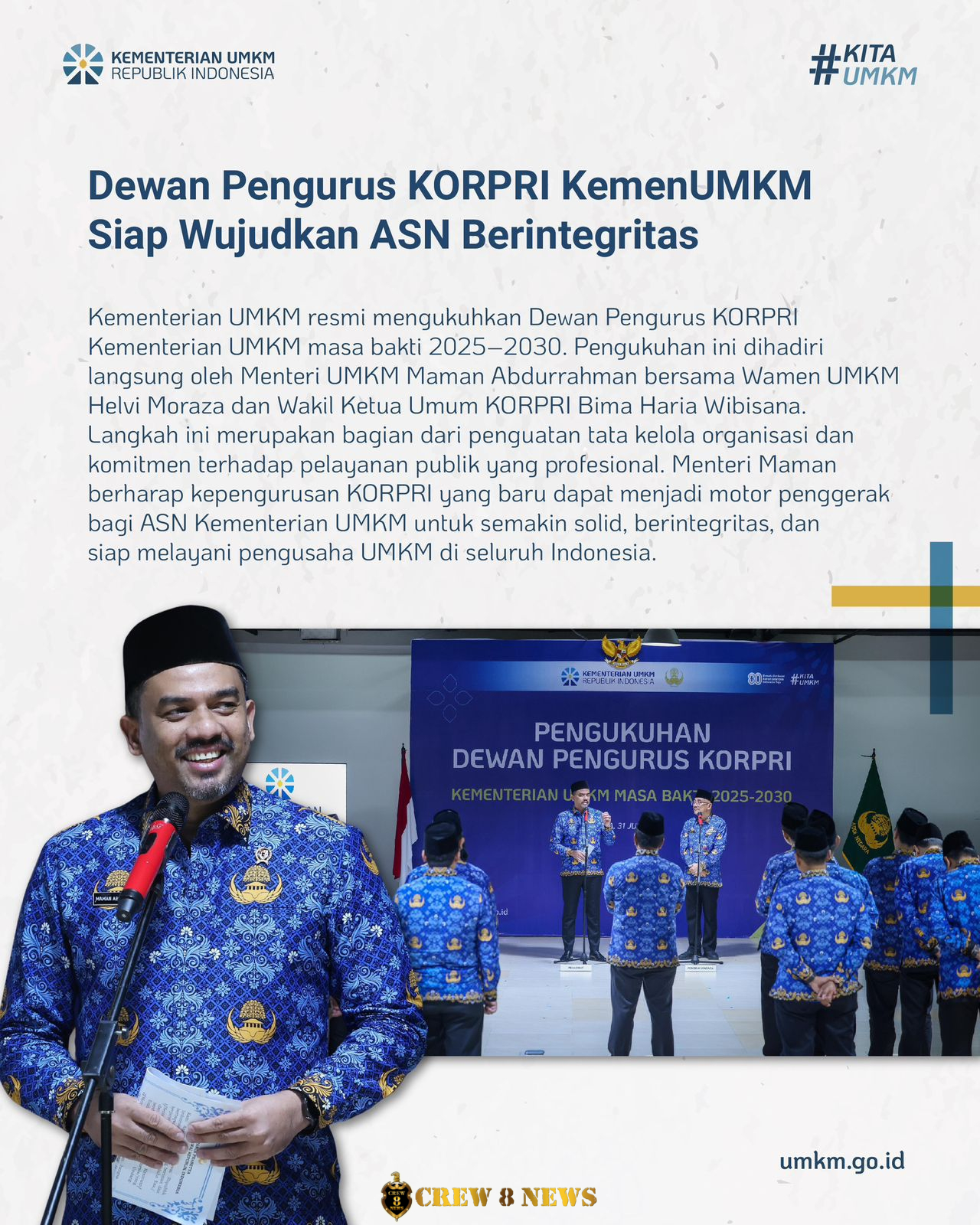 Di lingkup internal, KemenUMKM mengukuhkan Dewan Pengurus KORPRI periode 2025–2030 sebagai upaya penguatan tata kelola organisasi dan pelayanan publik profesional berbasis integritas ASN.