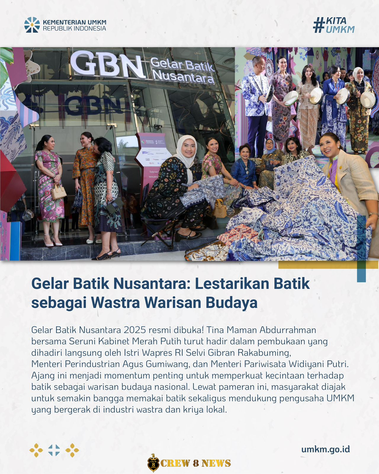 Pada sektor budaya dan ekonomi kreatif, Gelar Batik Nusantara 2025 resmi dibuka sebagai ajang pelestarian wastra nasional, mendorong kebanggaan masyarakat menggunakan batik, serta memperkuat UMKM kriya.